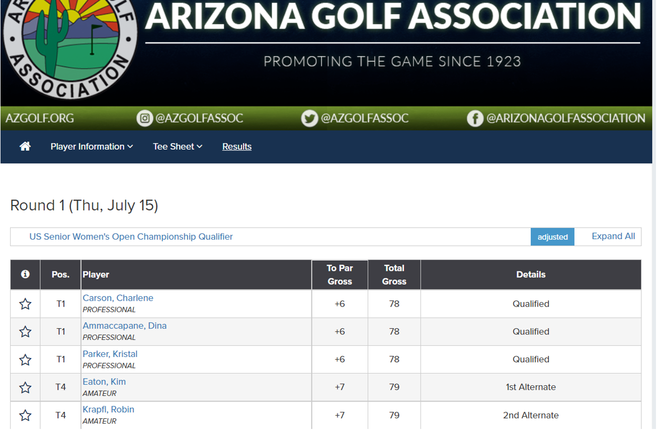 I did make 2 birdies, worked extremely hard for 8 bogeys and enjoyed 8 pars. (I love PARs by the way!) I was fortunate that it was just enough that day to end up in a 3-way tie for 1st with a 78. And the exciting part is that there were 3 spots from our qualifier that earned an invite to the 3rd Annual US Senior Women’s Open.